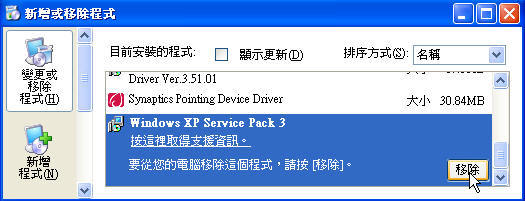 若是要移除 ,則必須進入控制台的新增移除程式 ,然後 ,選擇 "Windows XP Service Pack 3" 項目 ,並點選移除