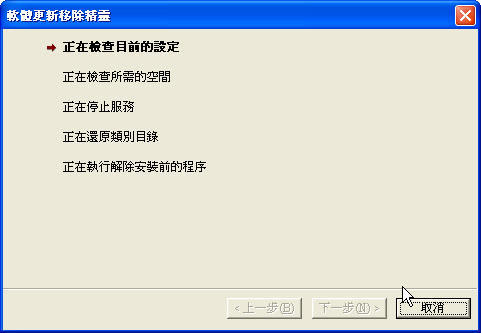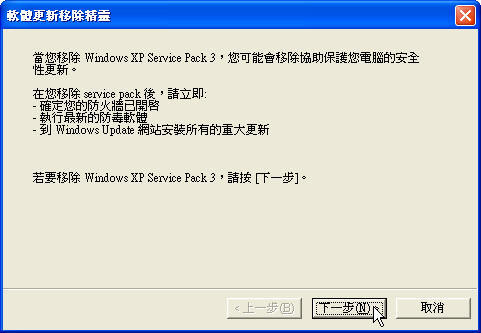 點擊移除後 ,將會出現 軟體更新移除精靈 ,提示的畫面主要是告知使用者 ,任何在安裝 Windows XP SP3