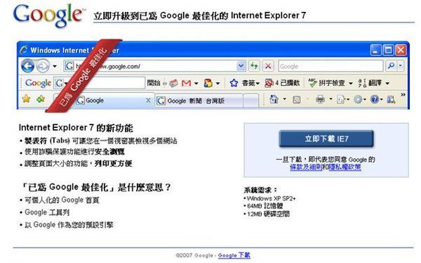 你可以從GOOGLE搜尋 IE7下載由GOOGLE最佳化處理過的IE7版本.