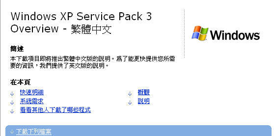 當然 ,如果還沒完成更新 ,或者根本不知道去哪裡下載,則請可以從下面這個網址開啟 Windows XP SP3下載頁面 ,以手動升級安裝.