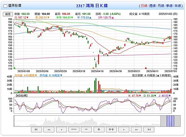 鴻海近兩月股價呈現先揚後調再創高的走勢。自2025年5月中觸及波段高點約163元後,股價經過約三週回檔至6月初低點151.5元左右,隨即在AI伺服器題材帶動下強勢反彈。截至7月1日除息前最後交易日,鴻海收於約166元,已逼近先前高點水平。整體技術線型偏多,市場氣氛亦因題材利多而轉趨樂觀: